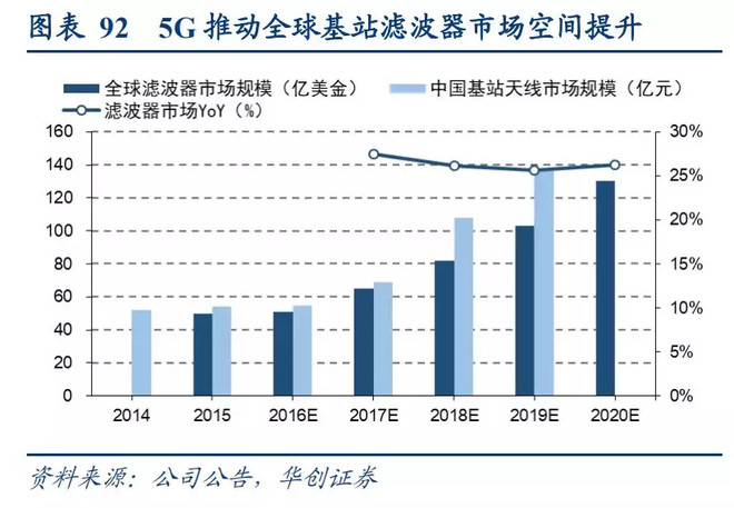 2019年5G商用化确立,其将推动终端射频器件滤波器的需求和价值提升。一方面,在高频电子设备中,手机滤波器作为手机射频前端器件中所占比重最大器件,在5G NSA过渡网络的构建下将驱动市场份额的增加;另一方面,基站滤波器作为射频系统的关键组成部分,在5G基站大规模建设下,也会迎来巨大的增量需求。