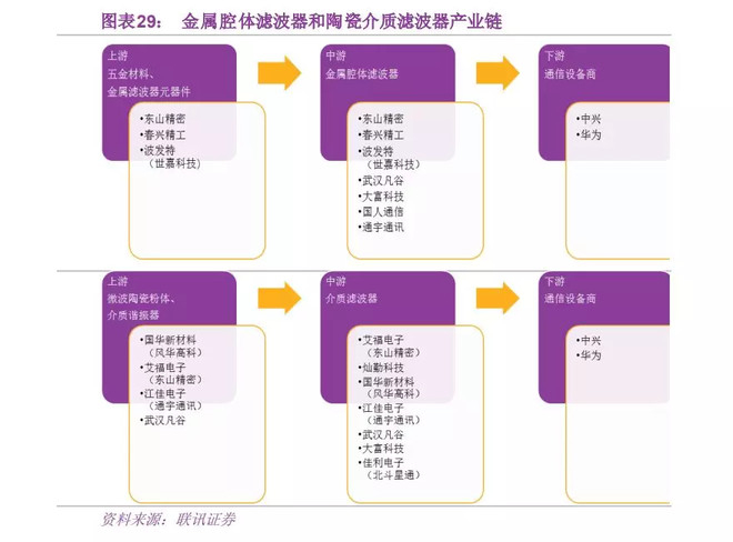 若按制造材料性质分类,滤波器被分为金属腔体滤波器和陶瓷介质滤波器。在产业链下,金属腔体滤波器包括上游五金材料,金属滤波器元器件、中游金属腔体滤波器、下游通信设备商三大环节。其中主要负责上中游的厂商有东山精密、春兴精工、世嘉科技、武汉凡谷、大富科技等,下游设备商有中兴、华为。同理,陶瓷介质滤波器包括上游微波陶瓷粉体和介质谐振器、中游介质滤波器、下游通信设备商。主要负责上中游的厂商为风华高科、东山精密、大富科技等等,下游设备商是华为、中兴。