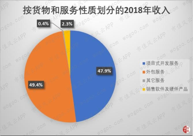 项目式开发服务占营业收入的47.9%,外包服务(注:即人力资源外包)占到49.4%。两者合计贡献了公司97.3%的收入。