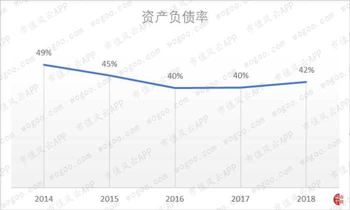 公司的负债水平近五年来呈下降趋势,2018年为42%。公司没有长期借款。
