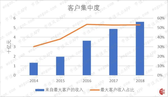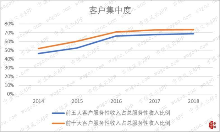 单就服务性收入而言,前五大客户占总服务性收入的比重在2018年达到69%,前十大客户的占比为73.6%。