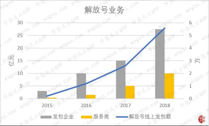 近四年来,平台发包金额的CAGR达到了204%,其中2018年超过28亿元。服务商数量的CAGR达到192%,2018年服务商和发包企业分别达到了2万家和5.5万家。