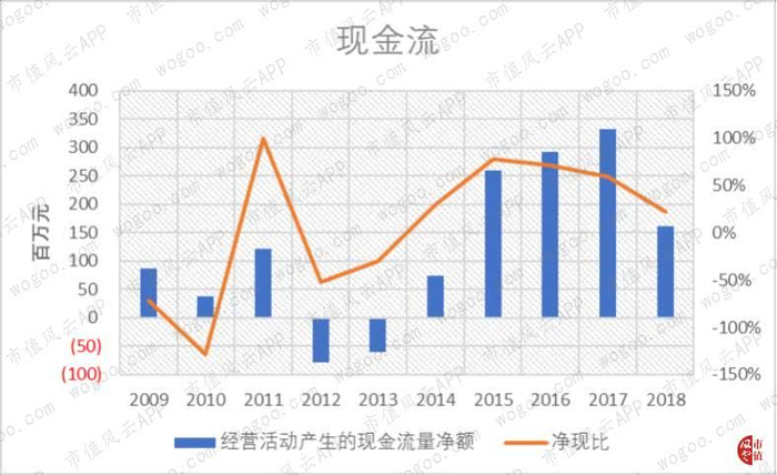 另外,公司近五年经营活动产生现金流量净额持续为正数,而且2015-17年的净现比(注:经营活动产生的现金流量净额除以净利润)均大于50%,现金流状况较好。