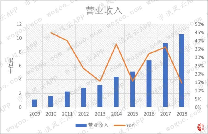 2018年公司收入同比增长15%,主要是来自核心大客户业务的稳健增长。近十年收入的CAGR达到28.5%。