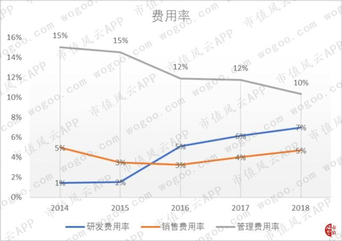 费用率方面,2018年管理费用率相比2014年下降了5个百分点,销售费用率不变,研发费用率则上升了6个百分点。