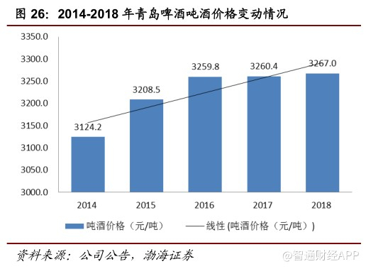 智通财经APP了解到,随着近年来啤酒产品因成本上涨被动调价、及高端产品比例的逐步提升,行业吨酒价格整体出现上涨趋势。据渤海证券研报显示,2014-2018年间,青岛啤酒吨酒价格由3124.2 元/吨上涨4.57%至3267.0 元/吨。