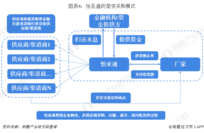 怡亚通是我国第一个以供应链服务为主营业务的上市公司。其中,作为第三方提供垫资采购服务是其重要的业务部分。第三方采购垫资业务兴起的背景是企业将供应链外包,由于产业链分工呈现国际化的布局,因此采购业务也表现为国际化的特点。国际化采购呈现出采购种类众多、货款支付频繁、进口报关手续麻烦的特点,因此,怡亚通在承接外包采购的同时,给企业提供垫资服务,然后再与企业统一结算。金融机构根据怡亚通的采购频率以及采购金额,提供相应的资金支持。