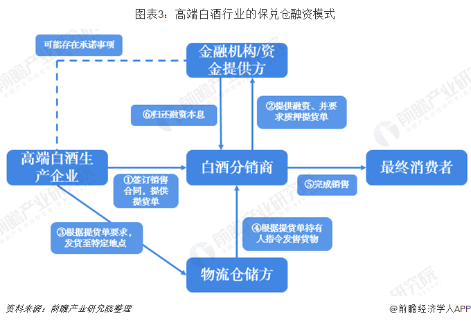 针对这种情况,金融机构通过控制白酒经销商与白酒生产企业签订的购销合同项下成品白酒的未来提货权,作为融资项下的质物,提供融资支持。并且金融机构要求,资金的确定用途是向制酒企业预付货款,并且预付款支付后所获取的提货单质押在金融机构。制酒企业根据提货单的需求将成品白酒存入指定的第三方物流企业的仓库,第三方物流仓储企业则根据金融机构指令向白酒经销商发货。白酒分销商完成销售后取得回款归还金融机构本息。