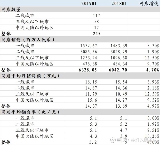2.同店销售:18-19年同店数量为245家。19H1同店翻台率为5.2次/天(+4%),其中一、三线城市同店翻台率为5.1次/天,二线城市为5.3次/天,翻台率提升主要由于餐饮体验不断提升,客流量提升。19H1同店销售额63.28亿元(+4.72%),主要由于同店翻台率的提升和客单价的提升。