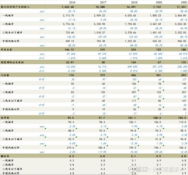 1.规模与盈利能力:19H1实现收入116.95亿元(+59.3%),净利润9.12亿元(+40.9%),净利率率为7.8%(-1pct),主要是由于19年新开餐厅的费用增加以及首次应用IFRS 16的影响,若剔除新租赁准则的影响,则利润增速会超过50%。