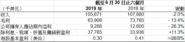 2019年上半年集团现有的游戏开发及发行业务和职务作品业务基本保持稳定,新游戏产品线仍处于研发投入阶段,研发工作进展顺利,整体业绩与去年同期基本上持平,收入总额达到1.057亿美元,同比轻微下降2.0%,主要由于2019年首六个月内容更新发布较2018年为少。毛利率由去年同期的68.4%轻微下降至60.5%,主要由于直接劳工成本增加所致。毛利为6390万美元。公司拥有人应占溢利及集团的除利息、税项、折旧及摊销前盈利分别为930万美元及3780万美元,较同期分别减少26.3%及增加11.3%。报告期内,游戏开发及发行、职务作品及其他业务分别为集团贡献86.4%、13.4%及0.2%的收入。