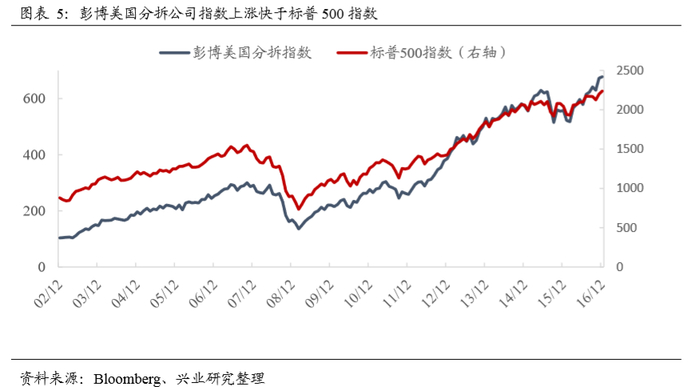 美国股市中跟踪分拆上市收益率的指数主要为“彭博美国分拆指 数”(包括过去 3 年内分拆上市且市值超过1亿美元的子公司股票)。用该指数和标准普 尔 500 指数进行对比,发现分拆上市后的子公司收益率要明显高出同期市场收益率。