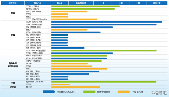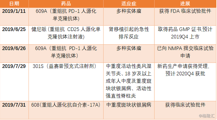 除核心成药销量喜人外,今年上半年,三生制药在研发上的也在加快脚步。相较于2018上半年研发投入1.78亿元,2019上半年研发支出2.64亿元,同比增加48.2%。目前在研药品共计有32项,其中生物药22项,化学药10项,抗体类药物16项,主要聚焦于肿瘤领域(11项),自身免疫性疾病(12项)以及肾病(6项)等领域。图表四与图表五分别为三生制药在研产品管线以及2019上半年研发进展情况。