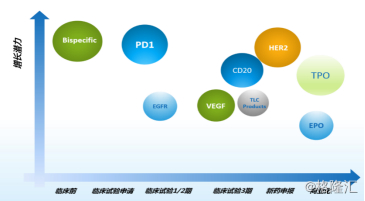 以最快的HER2靶点为例,2009年至2013年期间,三生制药已经成功在中国对HER2过度表达的转移性乳腺癌患者进行注射用人源化抗HER2抗体的开放式,多中心,前瞻性的临床III期试验,目前,国家药监局已经完成对赛普汀(伊尼妥单抗,抗 HER2 抗体) 的技术审查及临床试验数据现场核查。如若获批,将成为国内首个上市的国产HER2靶点单抗,具备迅速成为20-30亿元重磅产品的潜力。