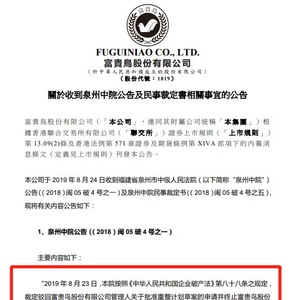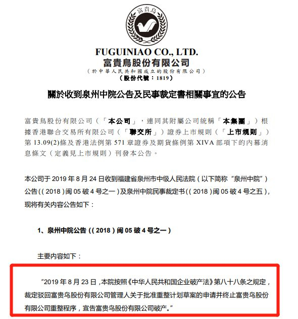 8月26日晚,富贵鸟发布公告称,于2019年8月24日收到福建省泉州市中级人民法院(以下简称“泉州中院”)公告及泉州中院民事裁定书,裁定驳回富贵鸟股份有限公司管理人关于批准重整计划草案的申请并终止富贵鸟股份有限公司重整程序,宣告富贵鸟股份有限公司破产。