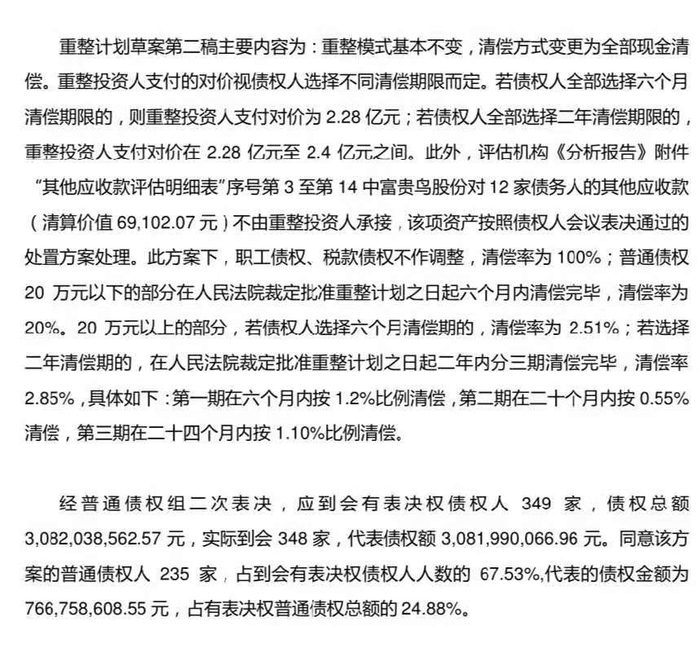 此前,富贵鸟两度提交重整计划草案。重整计划草案第一稿主要内容为重整投资人出资 2.25 亿元(其中 1.65 亿元为现金,6000 万元为购物券)。