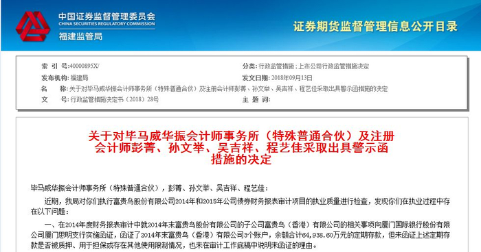 2018年9月13日,毕马威会计师事务所及当时的签字注册会计师因富贵鸟项目收到福建证监局警示函。