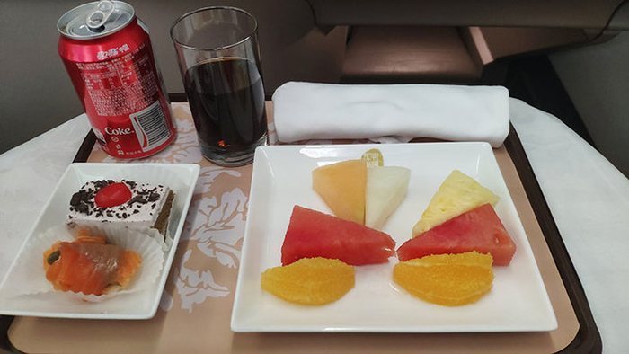 于是,哪怕你是坐的商务舱、头等舱,在国航的航班上即使是饭点,只要航程不足 2 小时,也只能啃几片橙子或用一包小零食凑合了。但国航比东航精明的一点是,是否发餐以航行时间为准,而不会出现东航起飞时间相差 15 分钟可能就是鸡肉饭/牛肉饭和花生米的巨大反差。