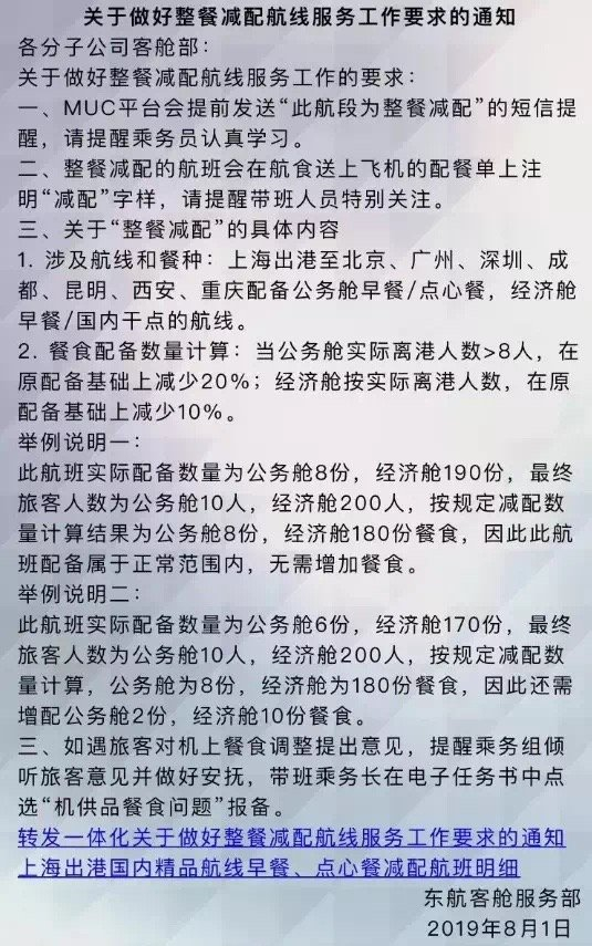 最先响应总局号召的是东航,仅在饭点提供正餐,具体如下: