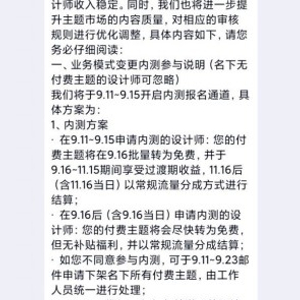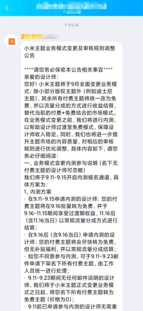 在业务模式变更之前,小米主题将对其进行内测,帮助设计师过渡到免费模式,保障设计师的收入,同时将进一步提升主题市场的内容质量,对相应的审核规则进行优化调整。