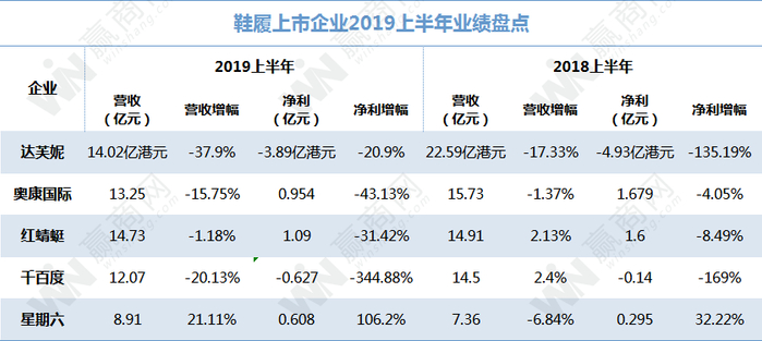 从中国上市鞋企已经发布的2019年上半年财报不难看出,包括达芙妮、红蜻蜓、奥康、千百度在内的鞋企上半年业绩均不理想。其中: