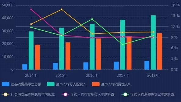10条地铁线加持、8座长江大桥横跨,交通基建腾飞之际,经济地位同步提升。赢商网查阅武汉地区经济数据获悉,2018年,新一线城市武汉常住人口已达1112万,GDP达14847.3亿元,全市人均消费支出持续多年上涨,成为中部暨长江中游地区第一大城市。(数据来源:市统计局)
