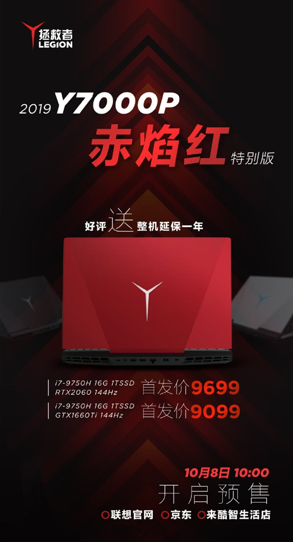 10月2日消息,从联想小新笔记本官方微博获悉,2019款拯救者Y7000P笔记本赤焰红特别版将于10月8日开启预售。