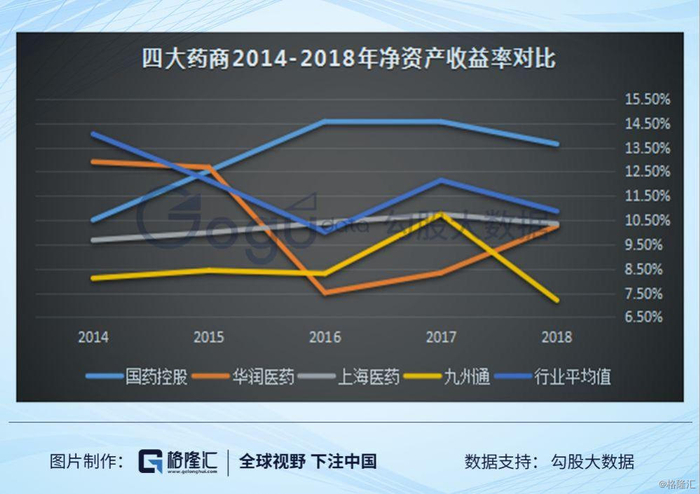 从图3-5可以看出,自2016年开始四家企业的净资产收益率出现了明显的拐点。最高的是国药控股,但是2016年之后出现了下降趋势,但仍然是四家企业中唯一高于行业平均水平。排名第二的上海医药过去五年都保持稳定,这与他药品研发的良好销售水平密不可分,而原本2016、2017年排名垫底的华润医药,在2016年开始“触底反弹”,在三个业务板块的良好增速下,2018年终于超过了九州通,而且是四大药商中唯一获得连续三年保持上升趋势的企业。而九州通则是这两年下降最为明显的企业,很明显公司出现了比较大的问题。