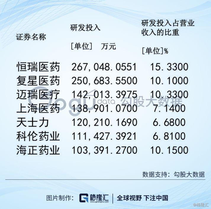 6、上海医药可以说是非传统意义上的纯药品流通企业,虽然从具体业务来看,目前主营业务收入还是来源于医药商业实现的收入,2018年为1396.22亿元,同比增长20.51%。但更特别值得称赞的是,公司还是一家非常注重药品研发的企业,2015-2018年上海医药的研发费用总额为6.2亿元、6.7亿元、8.36亿元、13.89亿元,2018年研发投入占营收比7.14%,排名第四,仅次于A股药企的恒瑞医药(26.7亿元)、复星医药(25.07亿元)和迈瑞医疗(14.20亿元)。