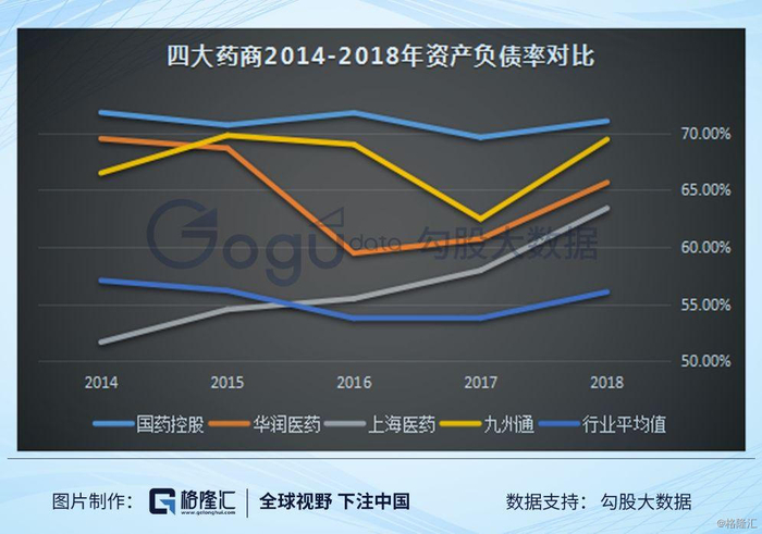 正如上面粽哥提到的,国药控股除了并购频频需要花钱之外,2018年还投入了高达38.66亿元的资金来开拓分销渠道、升级物流配送系统,这也导致了公司资产负债率在2017年达到最低后,又由69.61%上升至71.04%,2018年的负债总额同比增长26.18%,是行业里最高的。