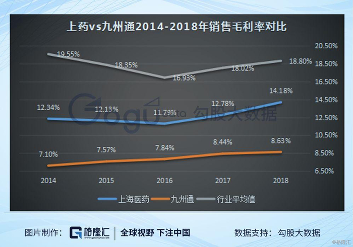 但如果对比毛利率,这个指标更能反映企业的营业质量。则上海医药的增速较为快一点,这也是由于上药除了药品流通之外,还有药品的销售,使得2017-2018年的毛利率增速快于九州通。如果保持这个发展态势,很有可能在未来赶上九州通。