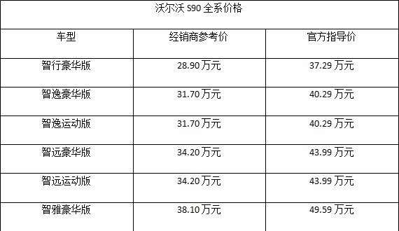 纵观沃尔沃S90整个车系,一共有六款车型可供消费者选择,分别是智行豪华版、智逸豪华版、智逸运动版、智远豪华版、智远运动版、智雅豪华版。官方指导价格为 37.29万元—49.59万元,但是现在终端有不小的优惠,目前上海地区经销商参考价为28.90万元—38.10万元。(数据来源于汽车之家)