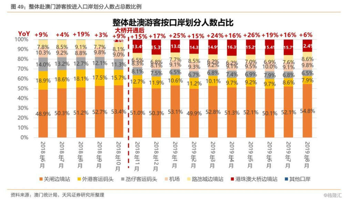 4)游客当中,虽然还以内地游客为主,但香港游客,特别不少是年纪较大的,也遍布在半岛一带的较低端娱乐场;另外,在香港当家佣的菲律宾和印尼游客,在各个景点和酒店也到处可见,但他们则主要以打卡拍照为主。我们认为这些游客主要受香港事件影响,在周末通过港珠澳大桥前往澳门。目前大巴票价单程为70港元左右,比船票低一半以上。5)我们之前也强调,这些当天来回的非过夜旅客或较难对澳门的博彩和零售产生贡献。