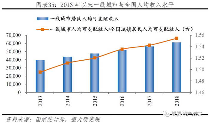 第三,高收入群体增长,对住房的消费能力及改善需求提升。虽然一线城市规划了人口规模控制目标,未来常住人口增长受限;但一线城市人均可支配收入与全国城镇人均可支配收入差距持续扩大,人口的收入结构将持续改善,高收入群体占比的增加使居民住房消费能力增强。