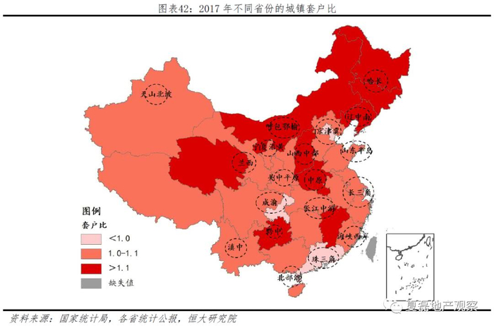 第三,居住条件改善空间差异。用2017年城镇套户比衡量地区住房是否存在短缺。一般而言,套户比低于1,表明存在住房短缺;套户比高于1,表明基本住房需求得到满足。当前各省套户比存在北高南低、内陆高沿海低的特征。其中,京津冀、山东半岛、成渝城市群所在省份城镇套户比低于1,表明还存在住房短缺问题,未来住房条件改善空间最大。哈长、辽中南、呼包鄂榆、晋中、中原和黔中所在省份套户比大于1.1;部分产业衰落、人口流出区域出现住房过剩现象,但核心城市吸引区域内人口流入,住房需求仍有支撑。其他省市群所在省份套户比位于1-1.1,住房短缺问题已基本解决,但仍存在进一步提升空间。