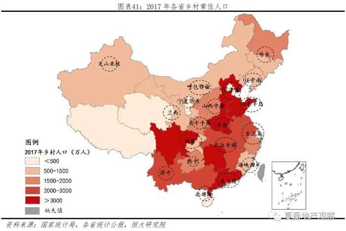 第二是农业人口城镇化潜力差异。除了区域间人口迁移,区域内部农转非也是城镇人口增长的关键来源。用2017年各省乡村常住人口规模来衡量这一需求,中部及东部城市群所在省份乡村平均常住人口在2000万以上,伴随中远期城镇化快速推进,农业人口城镇化空间较大。具体来看,包括中原、成渝、山东半岛、京津冀、珠三角、长江中游、北部湾和滇中城市群。