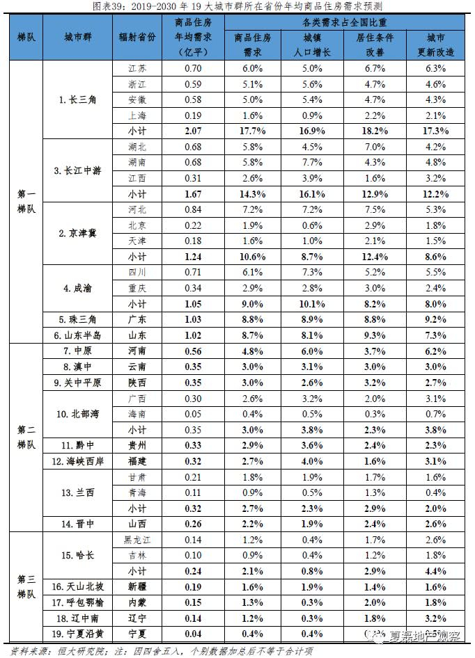 按照住房需求总量从大到小,19个城市群可分为三梯队。