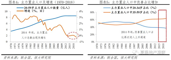 2014-2018年,我国累计典型城市商品房销售中90-144平方米的改善户型套数占比明显提升,表明住房质量改善需求下,居民更偏好功能完备的较大面积住宅。第二,城镇主力置业人口数量保持稳定,但年龄中枢上移,住房改善的能力提升。