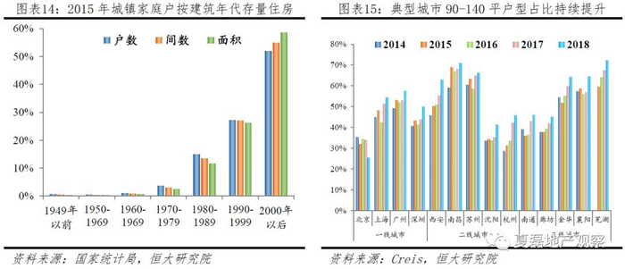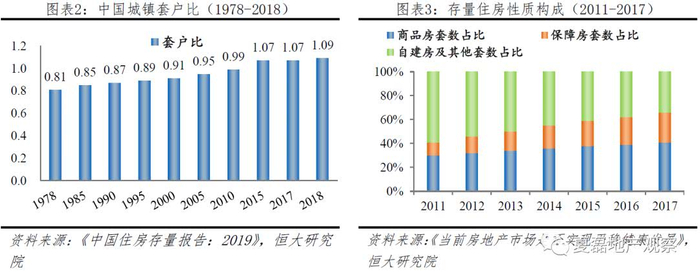 根据恒大研究院《中国住房存量报告:2019》,1978-2018年,我国城镇住宅存量从不到14亿平增至276亿平,城镇住房套数从约3100万套增至3.11亿套,套户比从0.8增至1.09。当前日本、美国、英国、德国的套户比分别为1.16、1.15、1.03和1.02,与发达国家对比我国住房供给总体平衡。但根据2015年人口小普查,我国城镇住房中成套率仅为85%,约20%为条件较差的平房,41%为1999年前修建。