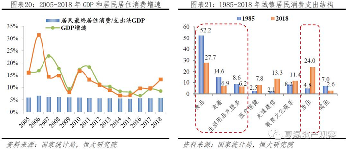 居民居住消费水平和经济发展水平相匹配。美国1960-2008年个人住房消费支出/GDP维持在8.5-10.3%,两者增速的相关系数达0.77;中国2004-2018年居民最终居住消费/GDP也稳定于5.4-6.6%,增速相关系数为0.59。国内外经验表明,经济发展会带动居民住房消费增加。一是住户部门收入增长带动居民整体消费增长;二是随着温饱问题解决,经济增长对住房消费带动力增强。以我国为例,1998-2018年城镇居民消费性支出增速和居民可支配收入增速相关系数为0.91,具有强正相关关系。1985至2018年,我国城镇家庭消费中用于居住的消费支出占比由4.8%提升至24%,吃穿用消费支出占比由75.4%下降至40.9%。