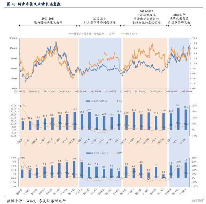 与多数体育品牌一样,特步发展经历了跑马圈地-行业低谷-力行改革-成果释放四个阶段: