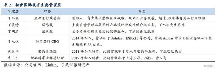 管理层方面,除丁氏三兄妹分别在公司内负责战略规划/产品设计开发及供应链/配饰业务工作外,公司2014年自Adidas引入现任特步品牌CEO李冠仪、2018年自阿里引入现任电商总经理黄惠华、2019年引入新品牌事业群总经理袁卫东,高管团队履历耀眼、实战经验丰富。