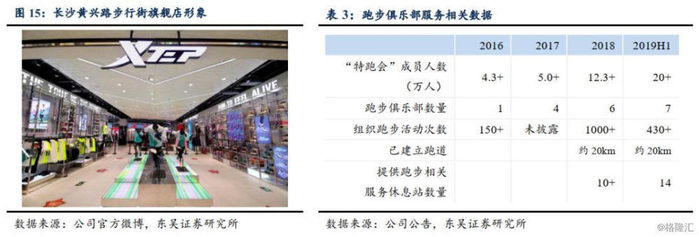 4)提升线下门店形象,建立跑步俱乐部服务会员:截止 2019H1,特步终端门店80%已经改装为国际化运动风格布局,升级为新店铺的零售店平均面积超过105㎡,给予更多陈列及体验空间,同时公司鼓励经销商进驻购物中心,目前购物中心及百货门店占比已达到20%;除常规门店之外,2016年开始推出跑步俱乐部,目前数量已经达到7家,分布在北京奥利匹克公园、南京玄武湖、厦门体育中心等地标性区域,跑步俱乐部内设更衣室及淋浴室、脚型测试及步态分析、奖章刻字及服装印刷、安全讲座及社交跑步活动、跑步训练营及马拉松赛事报名,全方位为会员活动提供便利,截止2019H1,“特跑会”会员人数已经达到20万+。