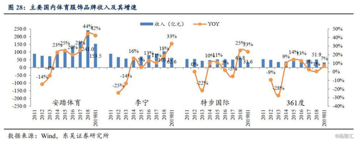 三年改革完成全方位能力进阶:与多数体育品牌一样,特步发展经历了跑马圈地-行业低谷-力行改革-成果释放四个阶段,其中15-17年的三年改革成为奠定公司18、19年业绩表现的重要基础,其包括:1)产品端:专注跑步领域持续研发高性价比产品,搭建从业余到专业差异化需求的“跑鞋矩阵”;2)品牌端:体育+娱乐双轨营销策略,体育方面一年赞助47场跑步赛事+体育明星代言人邀约,牢牢树立第一跑步品牌印象,娱乐营销方面持续更新代言人团队,植入《这就是街舞》、《明日之子》等大热综艺带动年轻消费者购买;3)零售管理:渠道扁平化+433科学发货模式,精细化管理带动零售提效,线下持续提升门店形象及消费者体验,线上专供款+O2O服务带动购买,而受益于上述产品品牌革新以及零售管控改善,特步在三年改革后的2018、2019年零售经营数据表现较前期有非常明显的提升——可比同店增长提升至双位数水平,零售折扣水平也控制在7.5-8.0折,库存周期更下降至4个月并得到保持,体现出全方位能力进阶后的体育龙头风采。