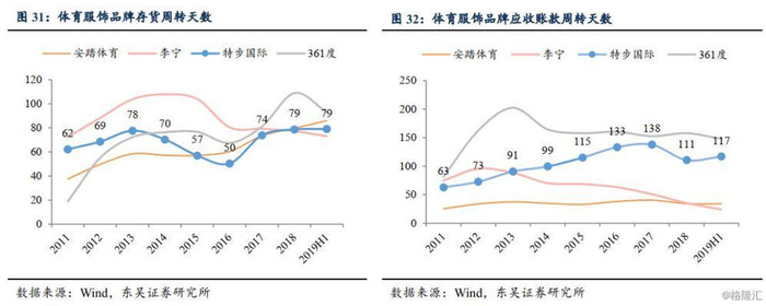 2)2012-2014年:金融危机+海外品牌加速进入中国市场+电商冲击下原有粗放批发模式缺点逐渐暴露,包括体育服饰在内服装行业库存危机集体爆发,本阶段特步收入规模下滑同时应收账款周转天数由11年的63天增加到14年的99天,侧面体现渠道销售低迷致分销商资金压力陡升,品牌陷入增长瓶颈;