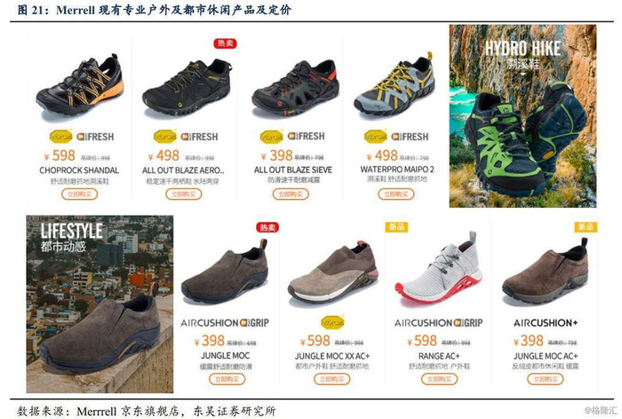Merrell:专业户外运动装备品牌,2020Q3正式展店。Merrell是1981年创立的美国专业户外品牌,1997年由Wolverine收购,目前在全球超过133个国家设有旗舰店,产品主要以专业户外徒步鞋以及都市动感两大系列为主,鞋类吊牌价集中在700-1000元,并有少量户外服装。目前其电商运营权仍在独立第三方手中,预计2020年收归合资公司运营,同时预计2020Q3起陆续于内地一二线城市铺设线下门店20-30家,希望通过丰富产品种类捕捉内地户外市场消费潜力。