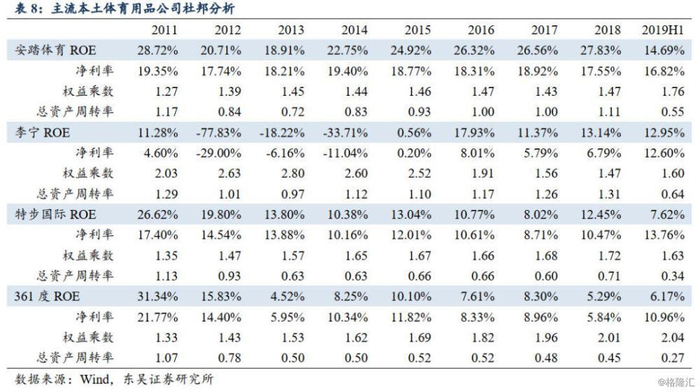 ROE:利润率及周转效率回升带动ROE上行。改革完成后的特步在2018年实现了净利率及周转效率的双重提升,带动ROE回升至12.5%。横向来看,安踏、李宁、特步近年都处在利润率回升、周转效率提升的状态中,体育行业整体繁荣,龙头从中更为受益。