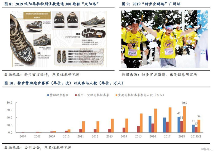 体育营销方面:强势赛事赞助+体育明星代言人邀约,牢牢树立第一跑步品牌印象。自确立跑步为战略品类后,公司在跑步赛事赞助持续加码,赞助赛事数量从2007年的1场提升至2018年的42场,参与人数也从1万人增加至70万+,19年赞助赛事数量预计更多,除了包括厦马在内的重点赛事公司将进行赞助并推出特别款跑鞋外,更从2016年举行“特步321跑步节”、2017年开始与腾讯合作“特步企鹅跑”等趣味跑步赛事;除赛事赞助外,公司更先后邀请谢振业、陈定、许周政等国家短跑名将作为品牌代言人,并与多个马拉松KOL建立赞助关系,提升品牌影响力。