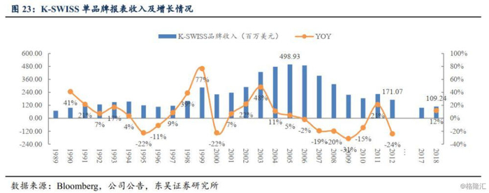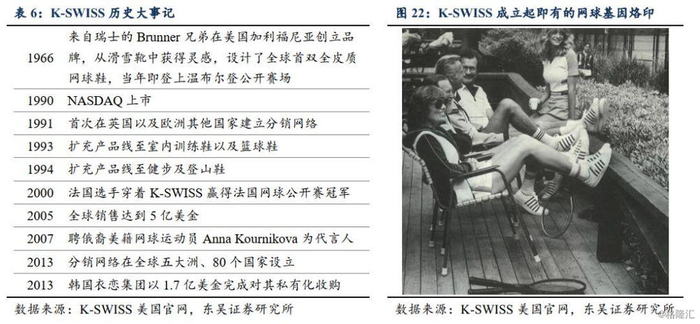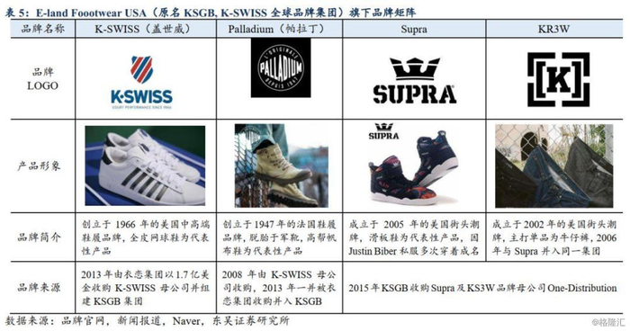 K-SWISS:美国老牌网球鞋品牌,2013年由韩国衣恋集团收购。K-SWISS是1966年创立于美国加利福尼亚的传统鞋履品牌,也是全球第一个制作全皮质网球鞋的品牌,始终致力于高性能网球鞋、休闲及健身鞋履的设计及销售,满足世界级运动员以及潮流达人追求高性能的需求。其一度作为NASDAQ上市公司全球销售规模达到5亿美金,但此后受到品牌老化影响销售规模萎缩、连续亏损,2013年被衣恋集团以1.7亿美元价格私有化。