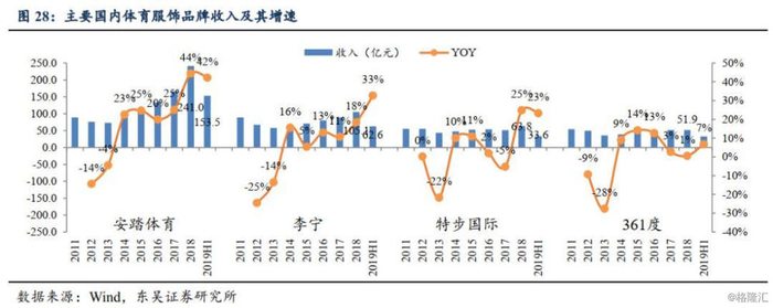 收入端:稳坐国内第三大体育品牌,18、19年增长势头明显。作为晋江体育代表公司规模维持在国内第三大水平,特步2018年达到63.8亿元,受益三年改革18、19H1收入增速分别达到25%/23%,作为具有一定零售规模的大众品牌(2018年零售规模122亿),增长表现已十分亮眼。